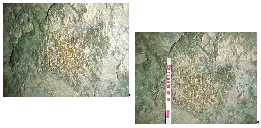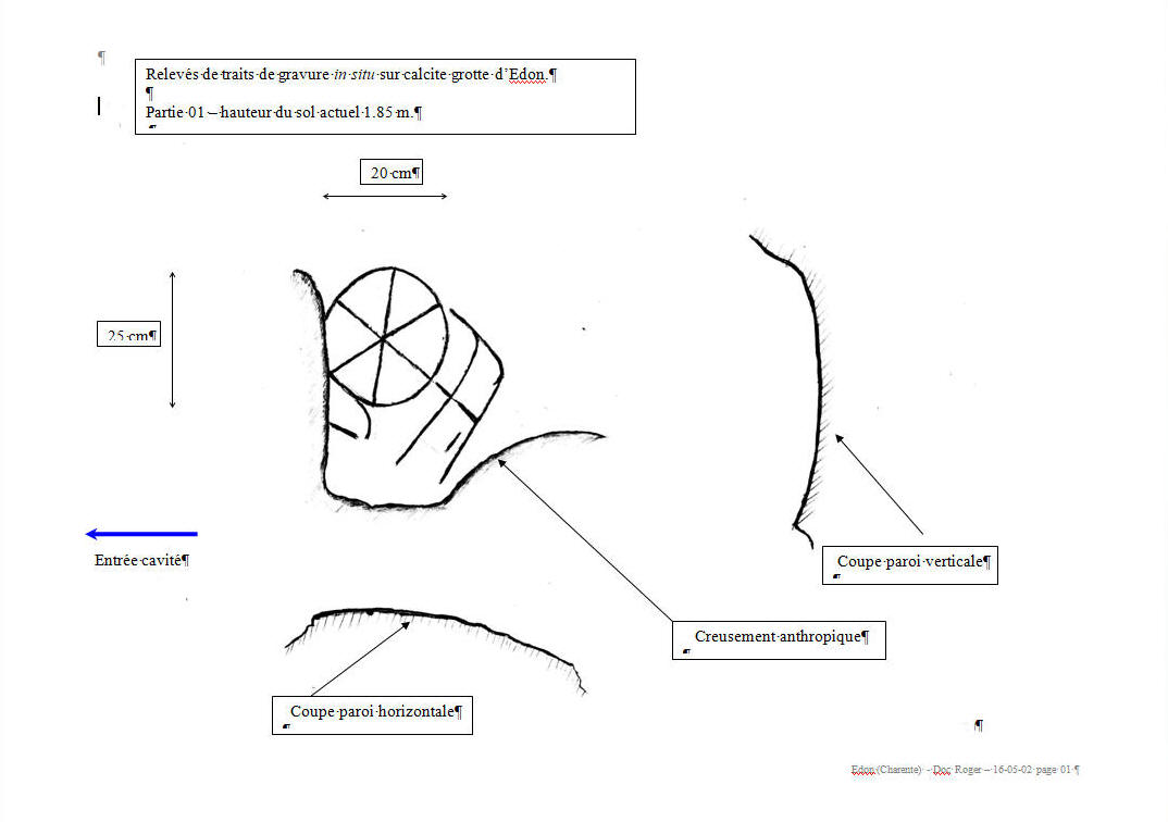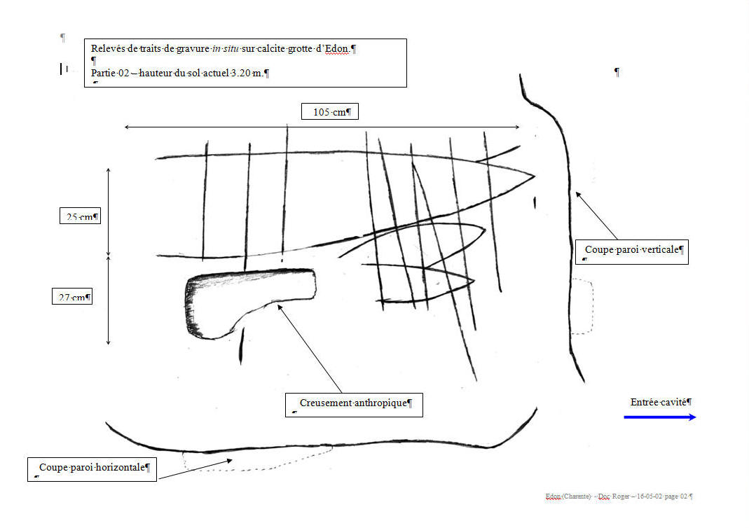 Notes sur les traces rupestres de la grotte d’Edon GénéralitésLes traces rupestres de la grande crête à Edon, se situent dans une grotte en haut de la falaise dominant la rivière "La Lizonne". Cavité naturelle liée à un karst dans un dépôt calcaire type Turonien du Crétacé supérieur, et plus particulièrement "Angoumien inférieur", blanc, massif, dur, finement recristallisé et sans débris fossilifères. Cette cavité se présente sous la forme classique d’un entonnoir avec un porche ouvert sur le Sud/Est de grandes dimensions (hauteur 3.60 m., largeur 2.75 m., profondeur 18 m.). La diaclase qui a permis sa formation est orientée Sud/Est – Nord/Ouest. Cette grotte ouverte au public, très visitée est dans un état de conservation très médiocre. Ses parois sont, surtout dans sa partie Sud/Est, fortement soumises à l’humidité. Son sol argileux semble exempt de toute fouille, le plancher stalagmitique semble intact. Le remblai avant du porche semble également en place mais réparti sur la verticalité de la falaise fortement en déclive vers la rivière puisque la grotte domine cette dernière d’environ 50 mètres. Ce site connu comme la grotte de la "Grande Crête" ne semble pas avoir fait l’objet d’étude. La grotte de « Gavechou » située à un niveau inférieur et en amont a fait l’objet d’une fouille par M. G. Chauvet en 1870, fouille qui avaient donné du Moustérien, du Solutréen et du Magdalénien. L’abri du "Fieux ou Cassine" (au niveau inférieur mais non située actuellement) a également fait l’objet d’une fouille en 1956 par M. Reparaz et avait donné du méso. Traces rupestresLes parois de cette cavité comportent des traits de gravure sur 4 points nommés de l’entrée vers le fond : Partie 01, Partie 02, Partie 03, Partie 04 Partie 01 (située à 5,60 m. de l’entrée initiale) La calcite de la paroi gauche comporte à 1,85 m. de hauteur, une série de signes (voir relevés et photos partie 01). Il est à noter que les creusements d’un couloir du souterain-refuge jouxtant la cavité et des niches dans la paroi ont partiellement détruit une partie de ces signes. Néanmoins la partie restante est bien conservée et parfaitement lisible. Ces signes qui semblent de même facture sont de toute évidence antérieurs aux aménagements anthropiques des parois de la grotte. Partie 02 (située à 9,10 m. de l’entrée initiale)La paroi droite comporte également une série de signes (voir relevés et photos partie 02). La particularité de ces signes est qu’ils se situent à 3,10 de hauteur par rapport au sol actuel. Cette disposition permet de penser que, soit le niveau du sol actuel de la grotte a changé, soit une élévation a été nécessaire pour confectionner ces signes. La même remarque que pour la partie 01 s’applique quant à l’époque de leur confection. Partie 03 (située à 11,80 m. de l’entrée initiale)La paroi gauche comporte à 1,70 m. de hauteur une grille (voir photos partie 03). Ces traces de facture différente semblent plus récentes. Partie 04 (située à 11,80 m. de l’entrée initiale)Immédiatement après la grille précitée deux traces semble être des représentations à connotation sexuelle (vulve et phallus) (voir photos partie 04). Environ à 1 mètre de ces "sculptures" à 1,05 m de hauteur se trouvent deux anneaux rupestres dont un est détruit. ConclusionCes traces ne semblent pas dénuées d’intérêt archéologique et une inspection ou une étude des parois de cette cavité pourrait apporter des éléments nouveaux. Une équipe de spéléo en ma présence a fait une reptation dans la diaclase terminale de cette cavité et m’a rapporté la présence, dans une cloche, de signes symétriques, sans autre précision. Mais vue l’étroitesse de ce conduit un dégagement de l’argile en place serait nécessaire pour pouvoir en faire une exploration plus approfondie. Guy Roger