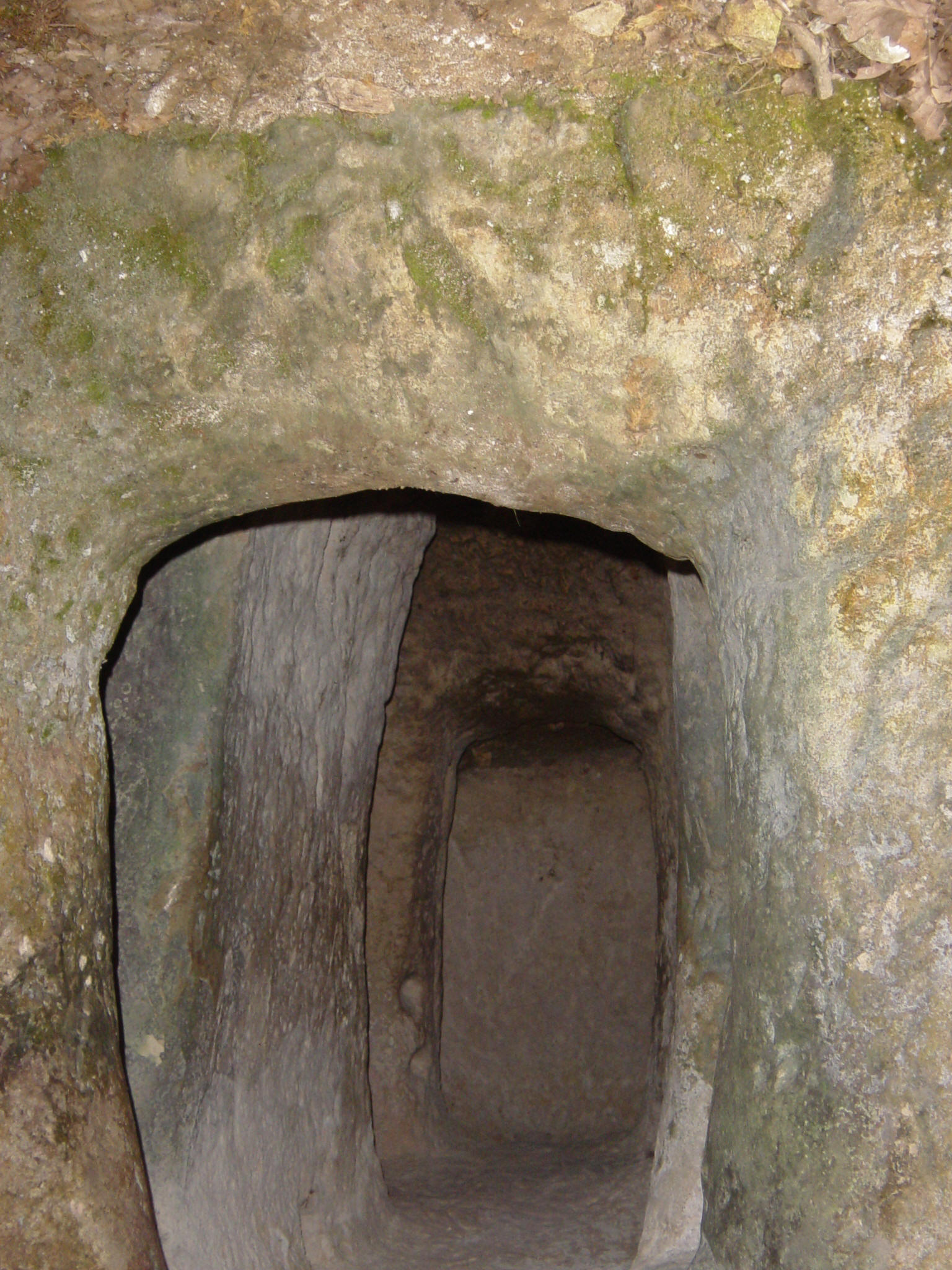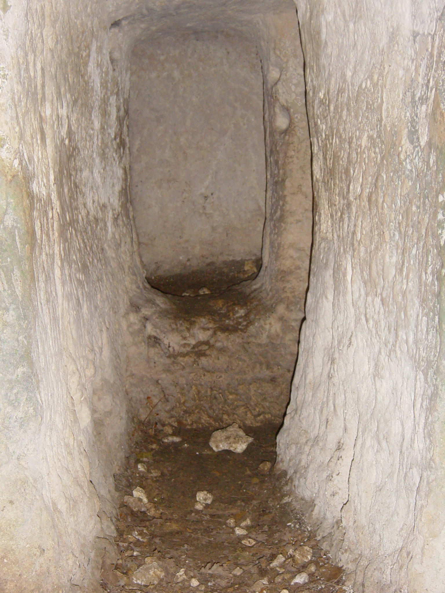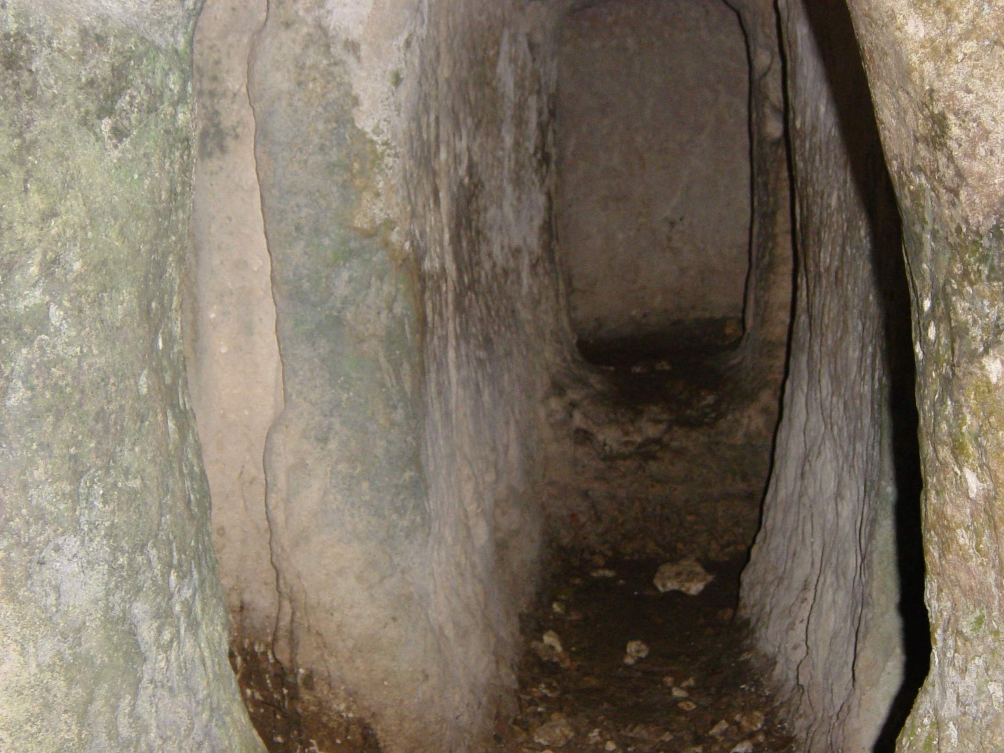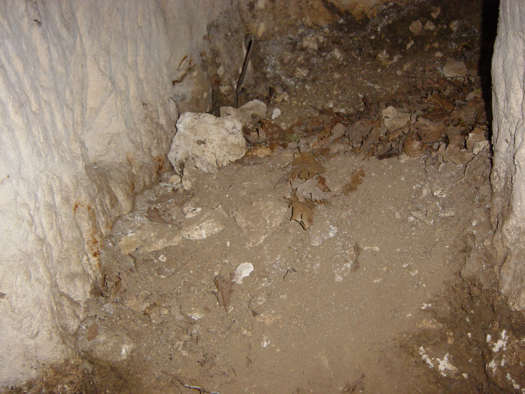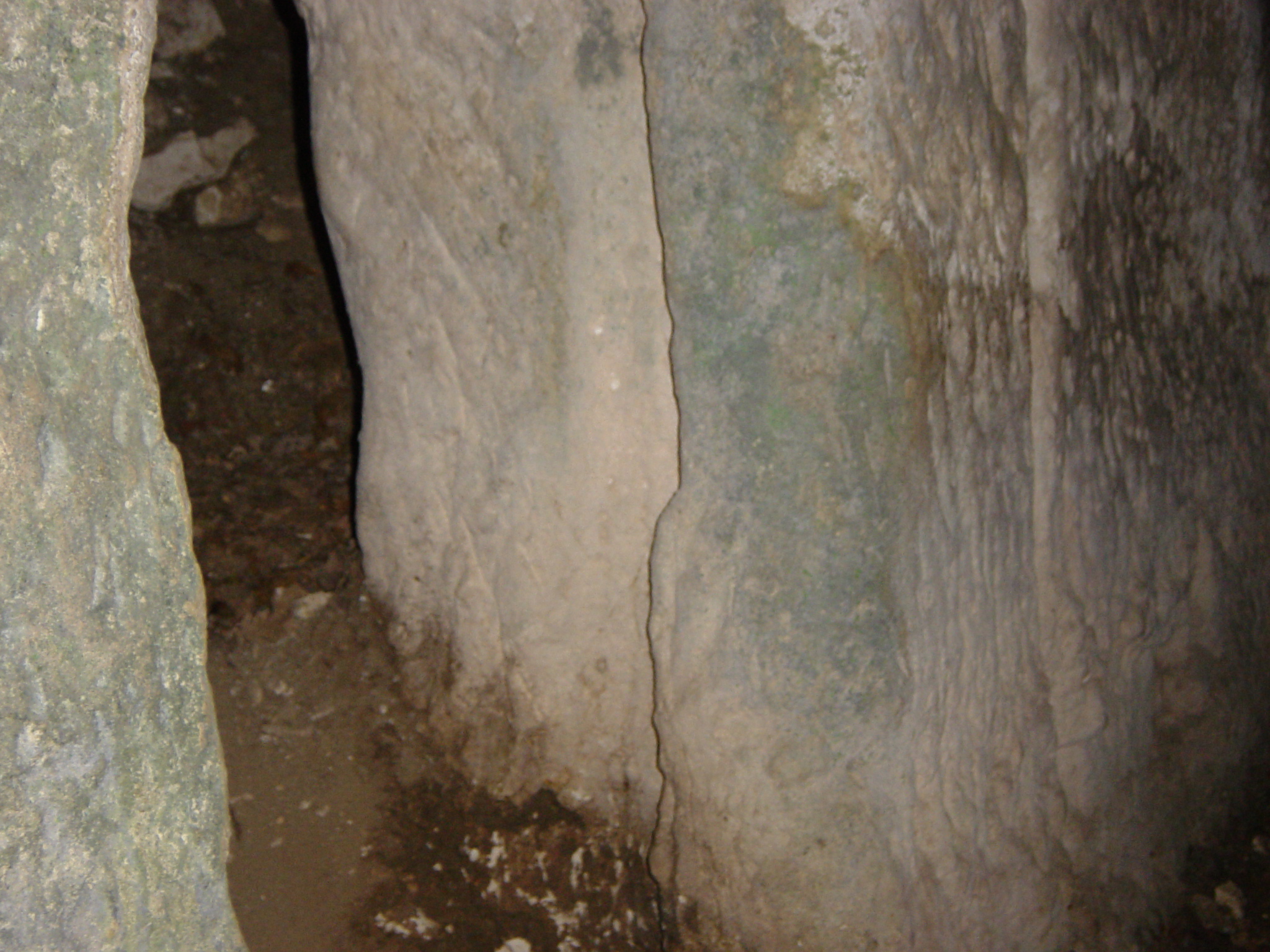 Détails du descriptif du plan d'Edon Extérieur Le site s’étale sur une largeur de 20 mètres près du plateau sommital de la falaise qui, par un encorbellement, a formé un abri sous roche. L’attention est tout de suite retenue par un bloc monolithique ayant la forme d’un escalier sous la voûte (photo 1) (hauteur s/voûte 3,20m) de la première partie Sud du site, « escalier » de 6 marches (largeur 0,56m, longueur de 0,40m à 0,55m, hauteur entre 0,15m et 0,20m). Au fond de cette voûte un accès au plateau sommital est possible par un passage naturel. Nous ne pouvons donner d’explications sur ce bloc qui semblerait néanmoins erratique. Le fontis devant la salle A, a été formé par l’éventration de la paroi Sud (photo 2). L’orifice d’un trou de visée se trouve au niveau actuel du sol extérieur. Son orifice intérieur est collé au plafond de la salle, son visuel intérieur/extérieur est ascendant. PARTIE SUD (Se rapporter au plan) Salle A La salle A (1) (hauteur 1,67m, longueur 2,27m, largeur 1,70m) comporte 4 trous de visée qui surveillent respectivement : · (2) et (3) la chicane Sud, (hauteur 0,50m), · (4) l’extérieur au Nord, (hauteur 1,67m), · (5) l’extérieur au Sud, (hauteur 1,60m). Une partie de la paroi Sud a été défoncée (6) et ainsi a été créée une ouverture (Æ 1 mètre) par laquelle on pénètre actuellement. Sur les parois on distingue également deux amorces de trou (7) de petit diamètre (Æ 0,05m hauteur 1,50m), ainsi qu’une niche d’éclairage (8). De cette salle on pénètre ensuite dans les deux chicanes par une ouverture en goulot (9) (Æ 0,60m), comportant un seuil à 0,50m du sol (photo 3). Chicanes A droite et à gauche du goulot, se trouvent deux chicanes : Une première (10) au Nord, venant d’une terrasse (12) qui surplombe de 2 mètres le porche de la grotte, tourne à gauche par un angle droit et par deux marches (11) conduit à l’intérieur. Cet accès est actuellement bloqué par une pierre épannelée (13) de mêmes dimensions que l’ouverture qui en ferme la passage (photo 4). Aucune feuillure n’est visible dans cette chicane qui ne pouvait être défendue que par cette « porte » en pierre (épaisseur 0,30m, largeur 0,60m, hauteur 0,85m). L’accès de cette chicane est surveillé par le trou de visée (4) de la salle A, trou de visée qui possède un visuel intérieur/extérieur ascendant. Une deuxième au Sud, plus classique devait être l’entrée initiale du site. Accès sous la voûte (15), angle orthogonal à gauche, suivi d’une feuillure de fermeture (14). Cette chicane est sous le contrôle des deux trous de visée (2) et (3) de la salle A (photo 5). Premier couloir Au-delà de ces deux chicanes un couloir (16) qui tourne ensuite à droite, nous emmène en face dans une petite salle. Ce couloir (largeur 0,60m, hauteur 1,60m) comprend une feuillure de fermeture rudimentaire (17) : d’un côté la feuillure fait toute la hauteur, de l’autre simplement 3 trous répartis à égale distance (0,40m). Une niche d’éclairage (18) se trouve à l’entrée de la petite salle (hauteur 1,55m). Petite salle Une petite salle (19) de faibles dimensions (hauteur 1,10m, longueur 2,10m, largeur 0,80m), surélevée par rapport au sol du couloir de 0,50m, comporte une niche d’éclairage (20). De part et d’autre de l’entrée les angles (21) ont été sculptés (photo 6 et 7) en colonnes engagées. Une tentative de confection d’une troisième colonne engagée a été commencée et rapidement abandonnée. Ces factures ne semblent pas être de la même époque que le creusement du souterrain. Deuxième couloir Le couloir (22) continue vers le Nord sur une longueur de 3,50m (photo 8) (hauteur 1,67m, largeur en bas 0,40m, milieu 0,70m, haut 0,50m) et débouche dans la grotte principale (24). Deux petites niches de même factures que les niches d’éclairage (23) ont été aménagées à 1 mètre de hauteur. Il pourrait ne s’agir que de simples trous de guidage du fait de leur faible hauteur. Ce couloir se termine par une petite feuillure de fermeture. GROTTE (Se rapporter au plan) Ensemble Une cavité rocheuse d’une hauteur actuelle de 3,20m environ suit une diaclase sur une longueur de 23,50m et sur une largeur de 3,50m à l’ouverture, se rétrécissant progressivement. Il semblerait que le niveau du sol ait été baissé de 1 mètre environ, comme en témoignent de nombreuses traces de creusement de part et d’autre de ce conduit. Face A La paroi A laisse apparaître des emplacements respectifs (de gauche à droite) : traces de poutraison verticales et horizontales pour grosses poutres (0,30m x 0,30m) · deux niches à différentes hauteurs, pourraient être des anciens bacs de captation et décantation d’eau. Un larmier venant du plafond de la voûte aboutit dans la plus élevée. · accès au couloir du souterrain, · virgules avec ancrage de poutre de moyenne section (0,10m x 0,10m), disposées par paire en regard avec la paroi B, · trois niches d’éclairages disposées en quinconce avec les niches d’éclairage de la paroi B, · anneau rupestre monolithe à 8,50m de l’entrée de la grotte (hauteur 1,20m). Face B La paroi B laisse apparaître des emplacements respectifs (de droite à gauche) : traces de poutraison verticales et horizontales pour grosses poutres (0,30m x 0,30m), · accès de la salle B, · une niche, · virgules avec ancrage de poutre de moyenne section (0,10m x 0,10m), disposées par paire en regard avec la paroi A, · trois niches d’éclairage disposées en quinconce avec les niches d’éclairage de la paroi A. Au plafond et sur les parois des traces de graffitis sont visibles, (grilles, triangles, …) plus quelques graffitis contemporains dans le fond de la grotte. PARTIE NORD (Se rapporter au plan) Salle B On accède par 3 marches à cette salle par une ouverture (hauteur 1,40m, largeur 0,70m) dont le niveau se trouve à 1,65m du niveau actuel du sol de la gro